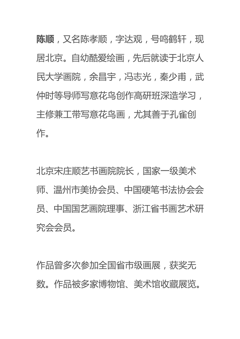 陈顺,又名陈孝顺,字达观,号鸣鹤轩,现居北京。自幼酷爱绘画,先后就读于北京人民大学画院,余昌宇,冯志光,秦少甫,武仲时等导师写意花鸟创作高研班深造学习,主修兼工带写意花鸟画,尤其善于孔雀创作。